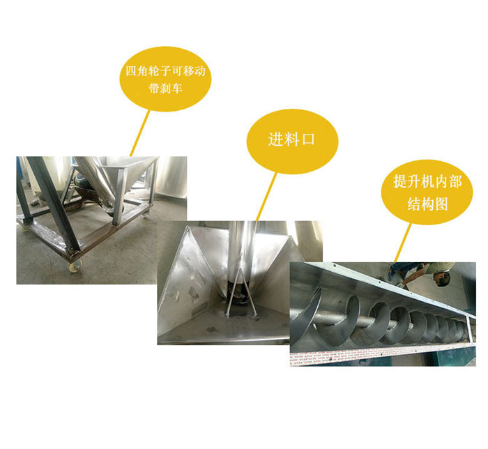 螺旋提升機(jī)產(chǎn)品概述該機(jī)適用于食品、醫(yī)藥、化工、塑料等行業(yè)的粉粒狀物料的輸送。可以與我司包裝機(jī)配套實(shí)現(xiàn)料位跟蹤自動(dòng)供料,也可單獨(dú)在其它場合使用。除電機(jī)、軸承、機(jī)架外其余為不銹鋼制成。可隨意移動(dòng),在水平、傾斜、垂直等位置均能連續(xù)輸送,它具有良好的密封性,無粉塵泄漏。可直接與其配套的設(shè)備連接固定,不需要地基基礎(chǔ),充分利用廠房空間。